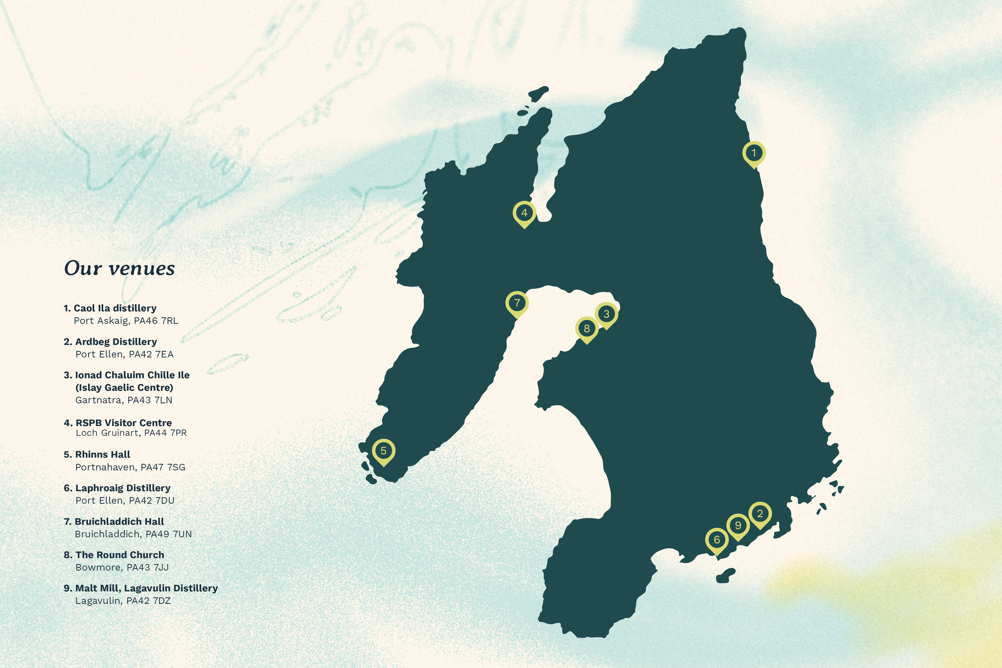 Our venues are unique. From whisky distilleries to gaelic colleges, bird sanctuaries and village halls.